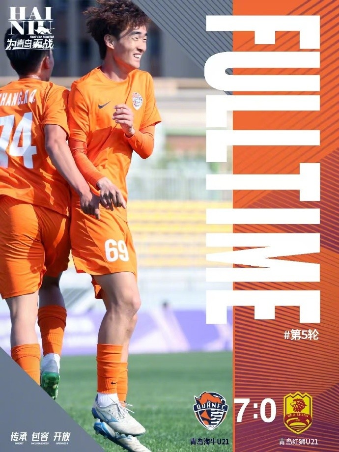 全场比赛结束,青岛海牛U21以7:0的比分大胜青岛红狮U21!